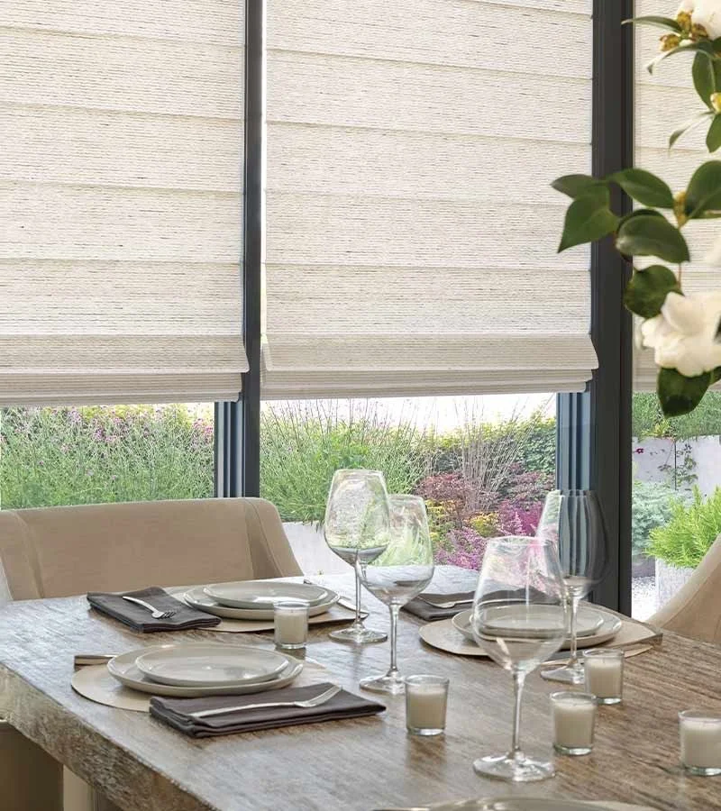 Roman shades are a timeless window treatment that combines the soft look of drapery with the clean functionality of shades. Made from fabric that folds neatly into horizontal pleats when raised, Roman shades add warmth, texture, and elegance to any room.
